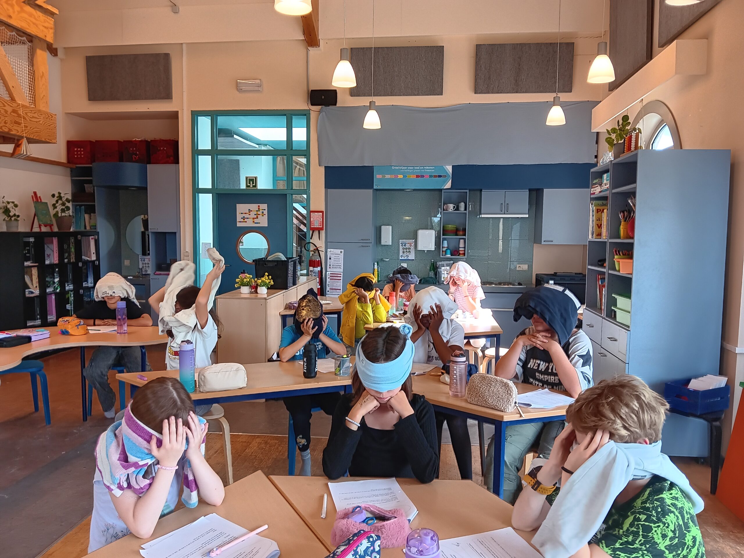 In de les WO startten we een nieuw thema: ‘Over ons lijf’. We benoemden de zintuigen en onderzochten het oog, het oor en de neus van dichtbij. We deden allerlei proefjes om meer te weten te komen: wat gebeurt er met de pupil bij fel licht, hoeveel decibel maken we als we samen schreeuwen, hoe voelt je oog als je een tijd niet knippert, lusten we alleen wat ook lekker ruikt…