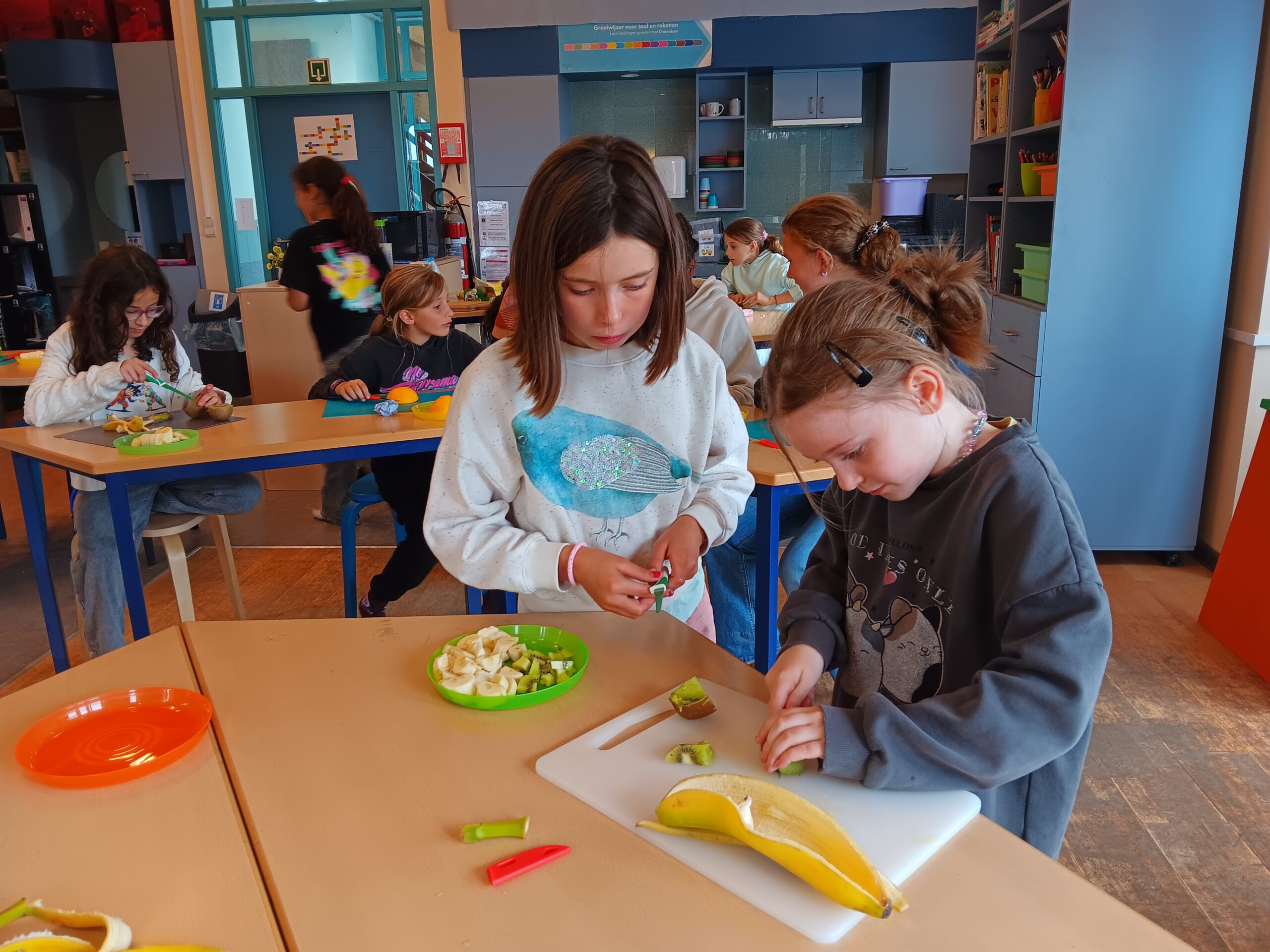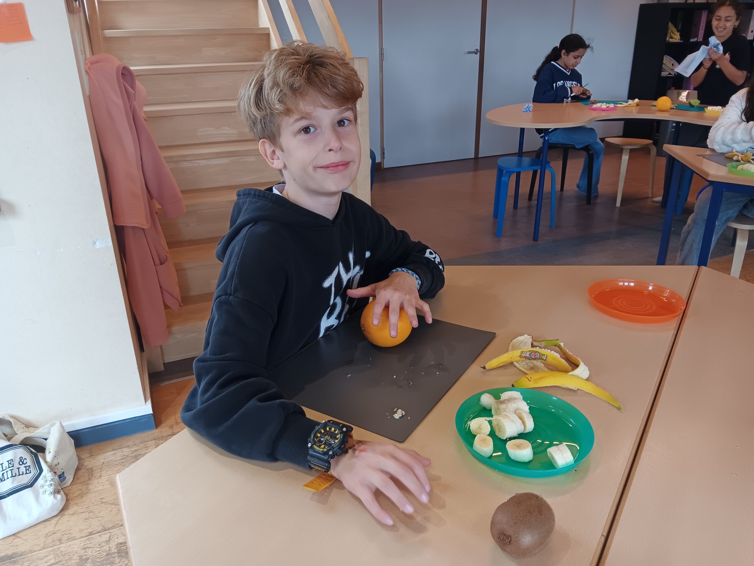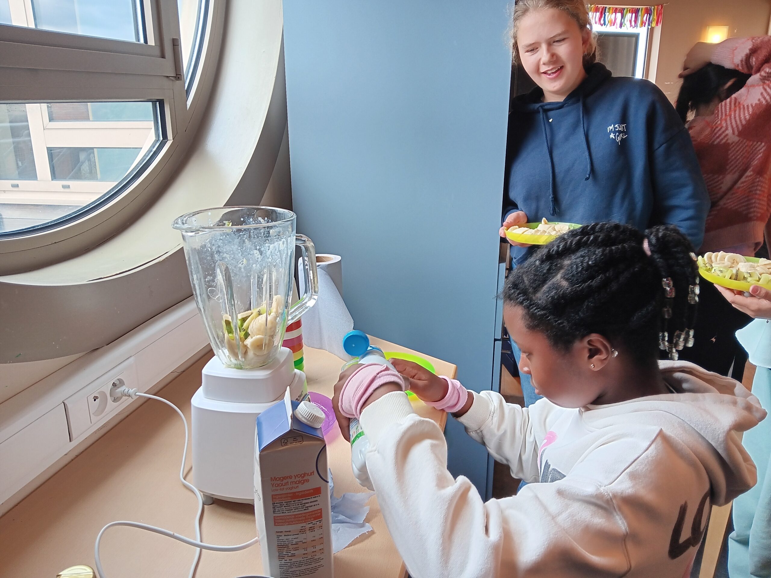 Op donderdag maakten we samen gezonde smoothies met banaan, kiwi, sinaasappel, melk, yoghurt en agavesiroop om de verjaardag van juf te vieren. Daarna kwam juf Lobke opnieuw in de klas en schreven we voor iedere klasgenoot een compliment op een post-it.