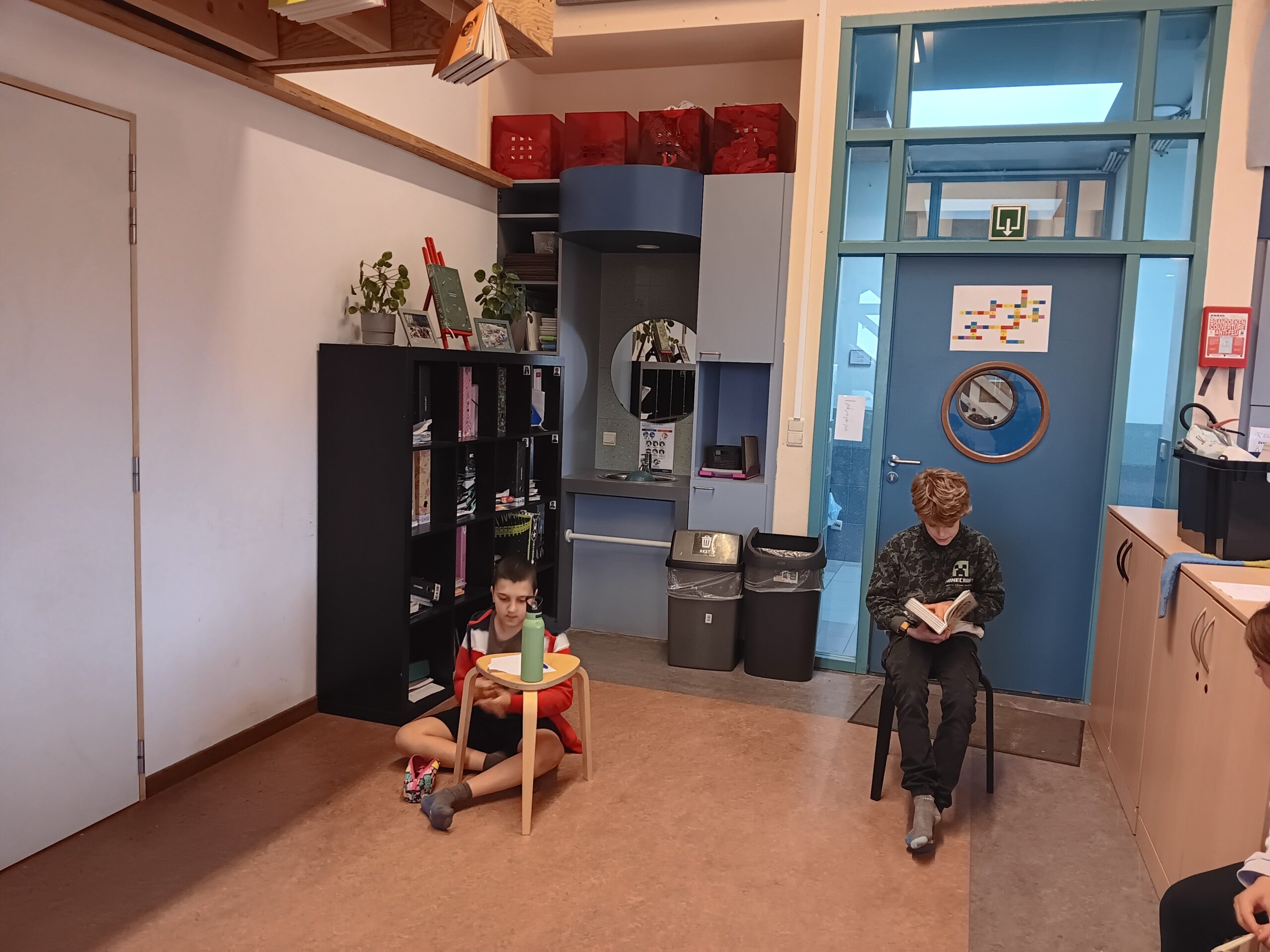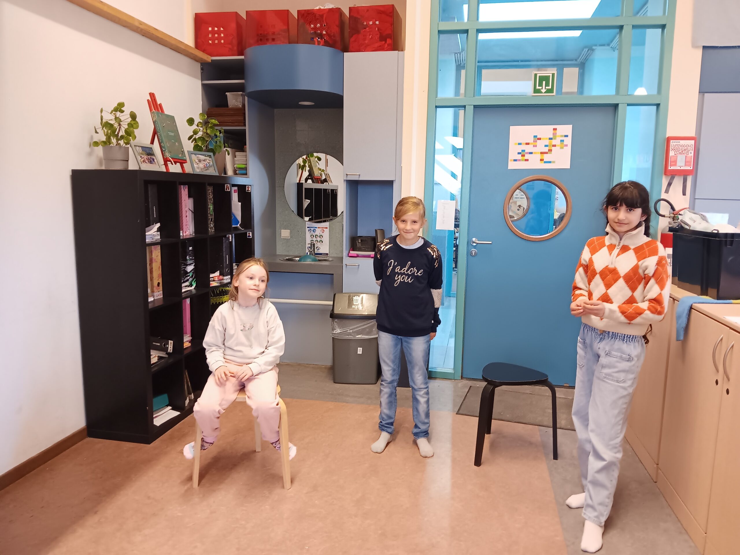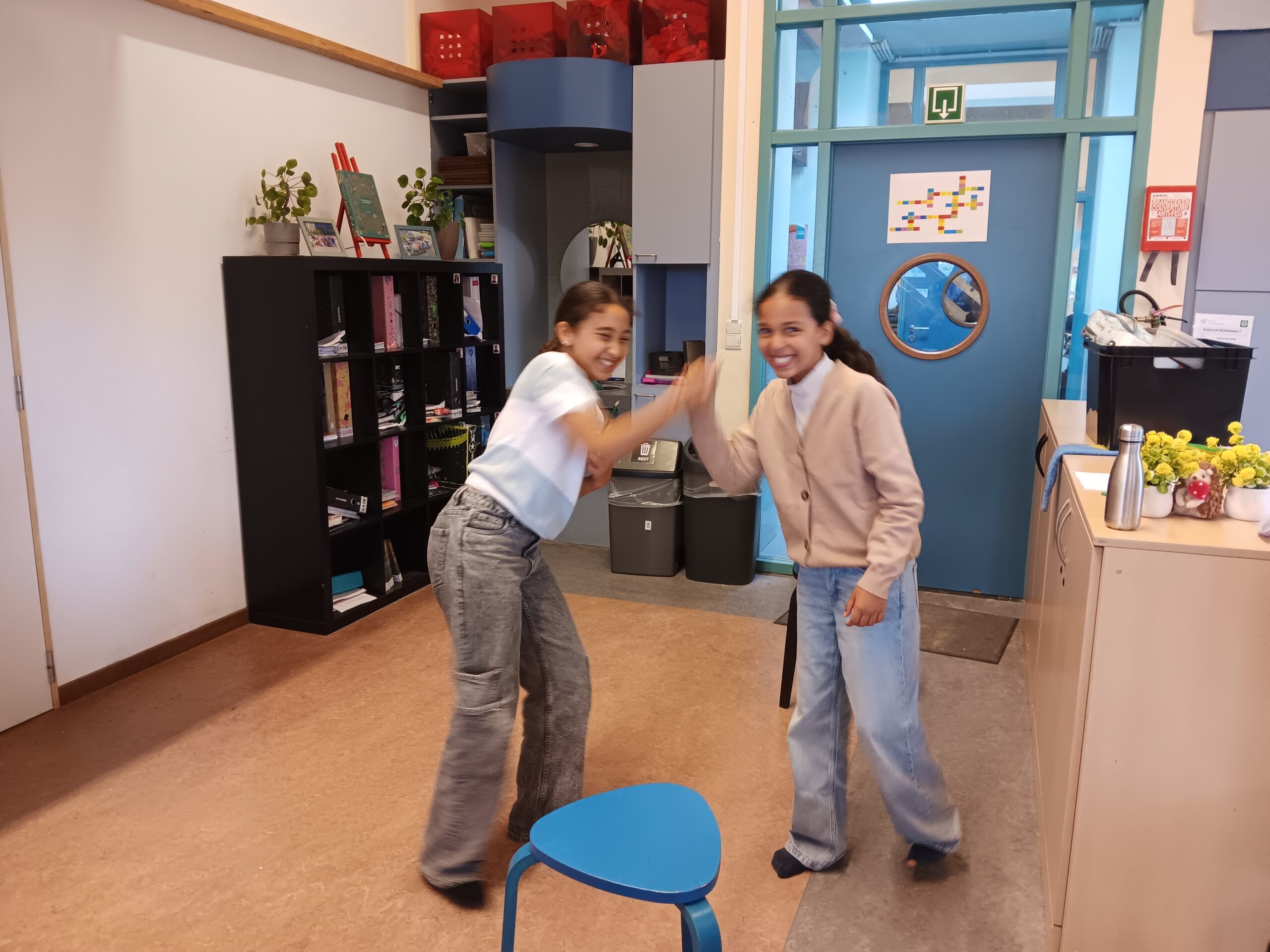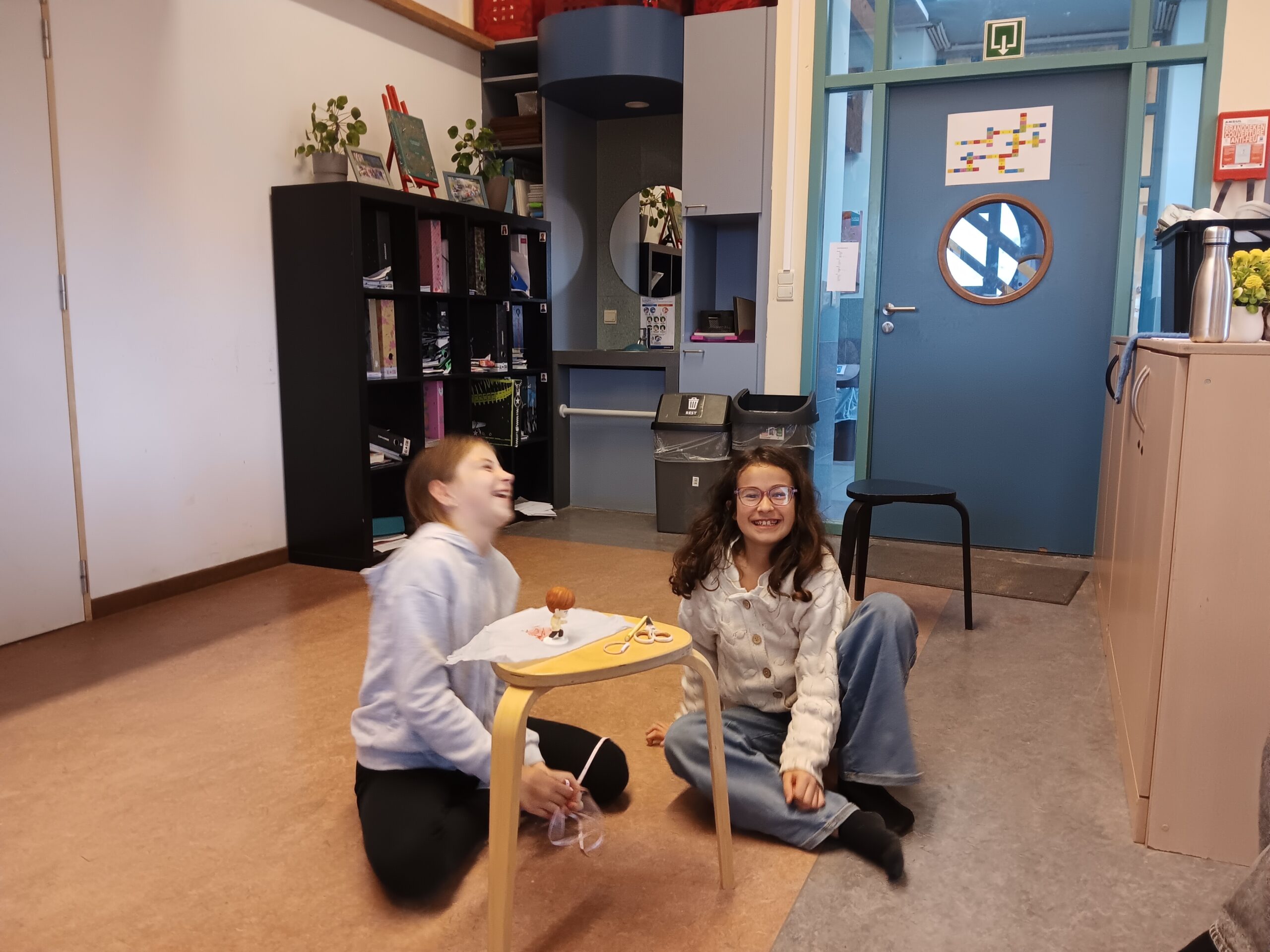 Tussen al dat denkwerk was er ook tijd voor een grappige dramales. Met een filmpje zagen we wat jabbertalk betekent: een fantasietaal waarbij je communiceert met allerlei klanken zonder echte woorden te gebruiken, en waarbij mimiek en bewegingen het verhaal mee duidelijk maken. Per twee speelden de kinderen een situatie waarbij ze enkel jabbertaal mochten gebruiken. Uiteraard was dat vaak heel erg grappig, maar velen durfden op die manier echt toneel spelen.